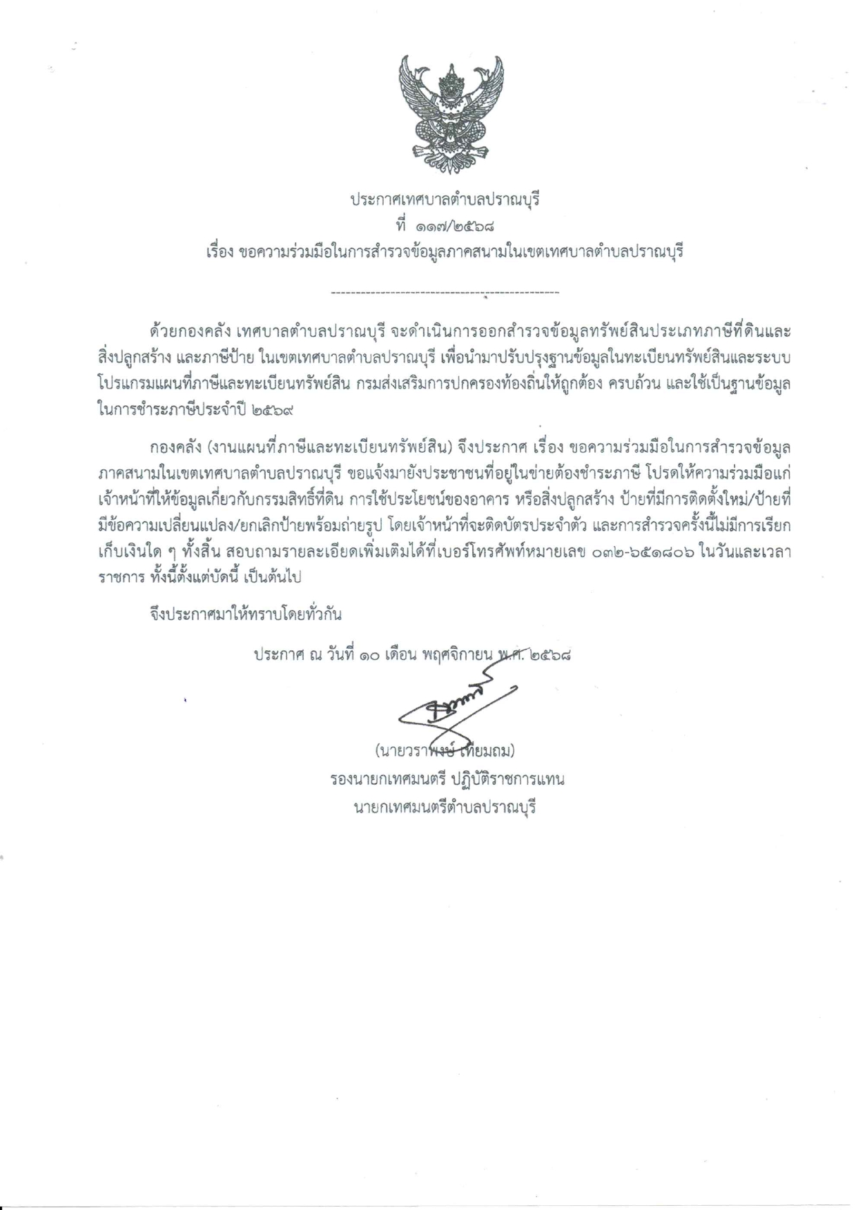 ประกาศเทศบาลตำบลปราณบุรี เรื่อง ขอความร่วมมือในการสำรวจข้อมูลภาคสนามในเขตเทศบาลตำบลปราณบุรี