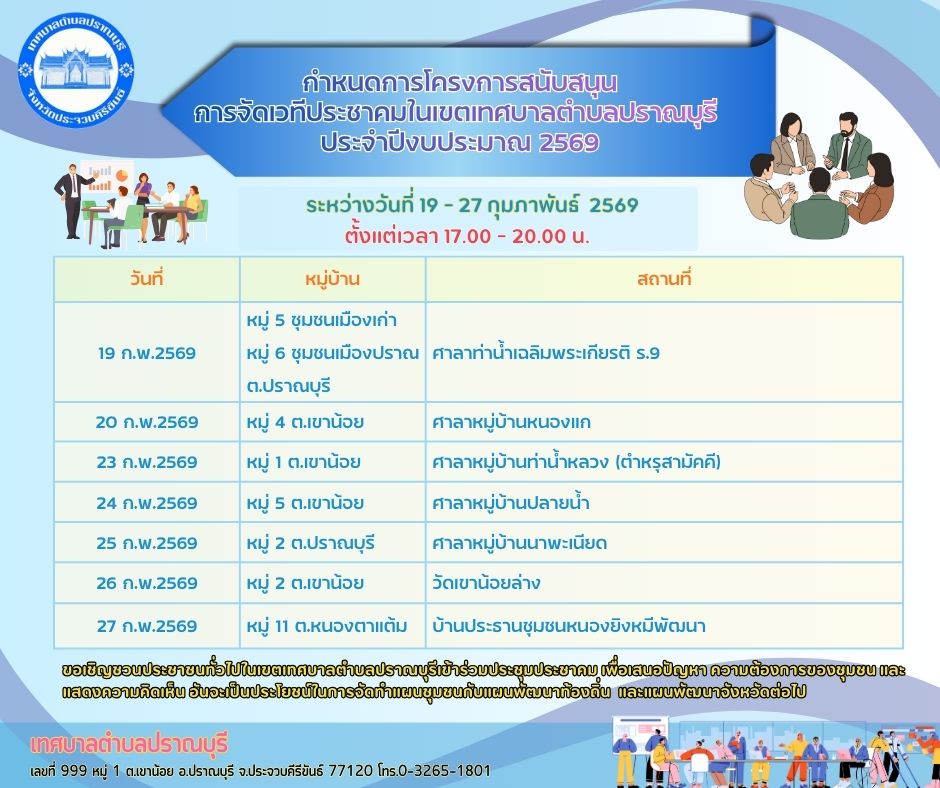 ขอประชาสัมพันธ์เชิญชวนประชาชนในเขตเทศบาลตำบลปราณบุรี เข้าร่วมการประชุมประชาคมหมู่บ้าน เพื่อเสนอปัญหา ความต้องการของชุมชนและแสดงความคิดเห็น อันจะเป็นประโยชน์ต่อชุมชน